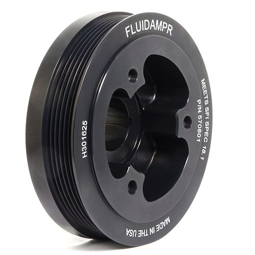 The Fluidampr performance damper is OE-sized at 6” diameter and achieves a 5 lb rotating weight thanks to its viscous damper design. It features a one-piece all steel construction and is SFI 18.1 spec for racing. It’s designed to last the life of the engine, requiring no rebuilds or tuning. Engine builders and DIY enthusiasts can enhance performance thanks to the inclusion of pre-drilled mandrel drive 3/8-24×1” UNF bolt holes on a 3.20” bolt circle pattern. In addition, an OE sized 6 rib serpentine accessory drive pulley is integrated into the outer housing. A laser-engraved TDC mark is included for reference.